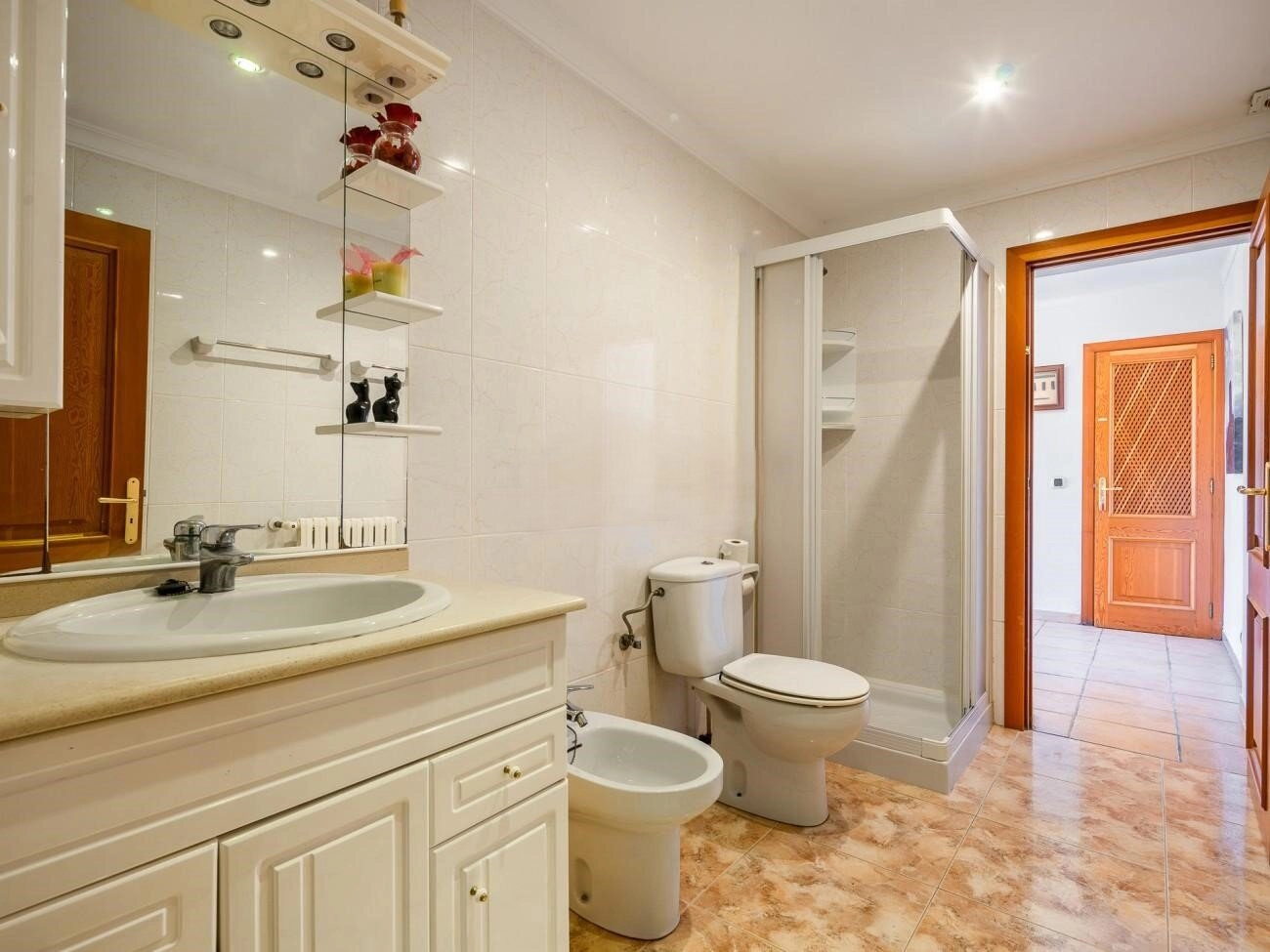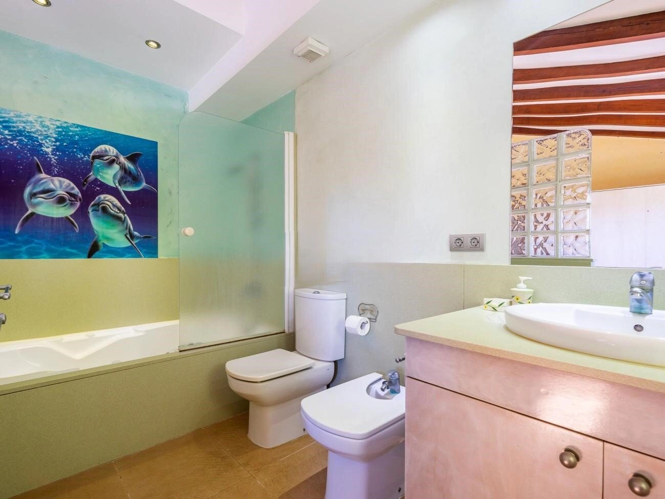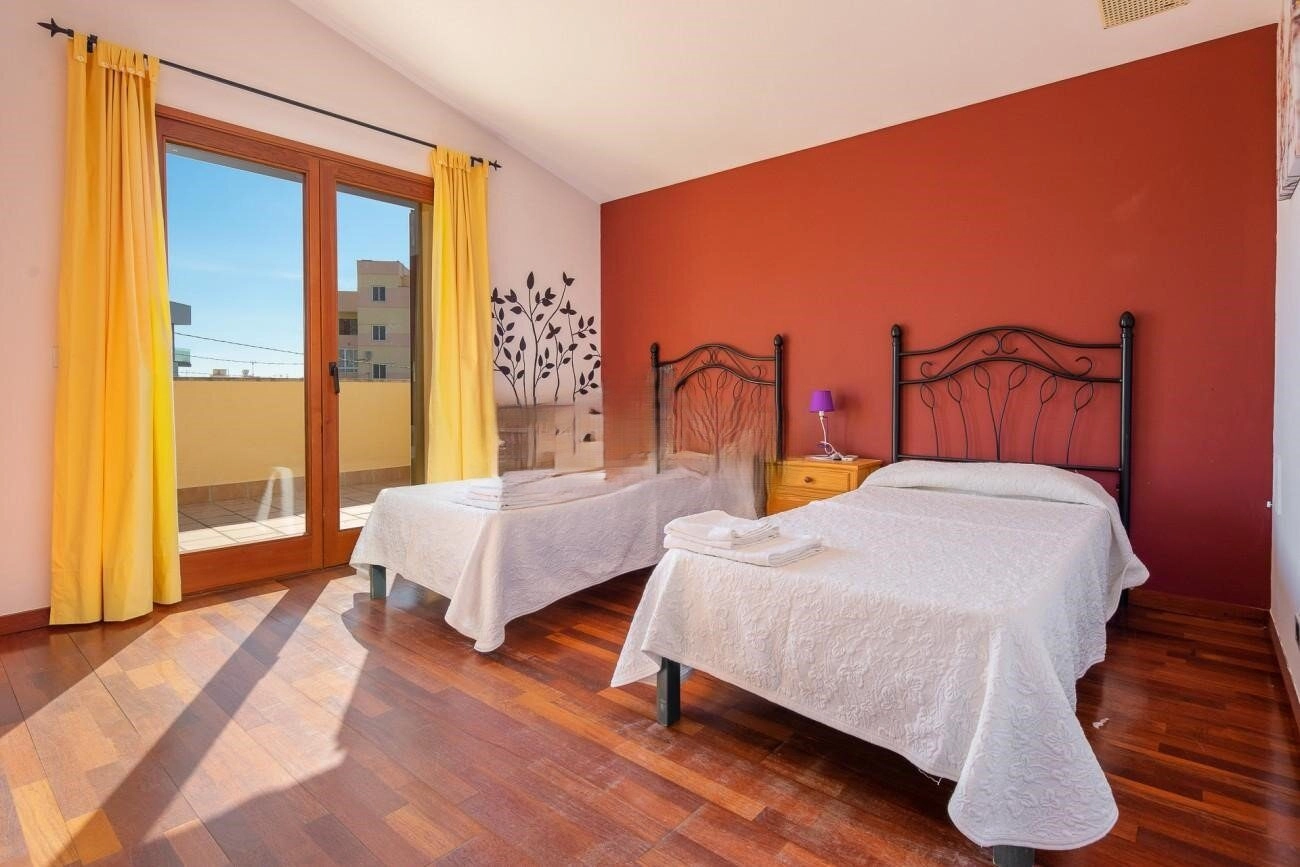 Im Erdgeschoss befinden sich die Eingangshalle, ein geräumiges Wohnzimmer, die voll ausgestattete Küche mit angrenzendem Esszimmer, das auf die Terrasse führt, und ein Badezimmer mit einer sehr praktischen Duschwanne, sodass Sie nicht nach oben gehen müssen. Die Schlafzimmer befinden sich im ersten Stock. Zunächst gibt es ein Doppelzimmer mit einem Doppelbett und viel Stauraum, da es von Kleiderschränken umgeben ist und außerdem über ein eigenes Badezimmer mit Badewanne verfügt. Es bietet außerdem drei weitere Schlafzimmer, eines mit einem Doppelbett und zwei Doppelzimmer mit jeweils zwei Einzelbetten. Diese drei Schlafzimmer haben Zugang zu einer Terrasse, auf der Sie die Sonne genießen und gleich nach dem Aufstehen ein gutes Frühstück einnehmen können.