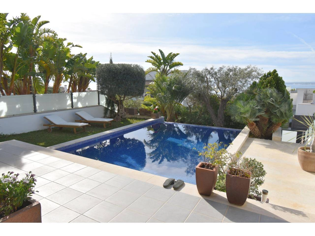 Im Erdgeschoss befinden sich ein Schlafzimmer und ein Badezimmer, das großzügige Wohn-Esszimmer mit Zugang zur Veranda, dem Pool mit Salzwasser und dem schönen Garten, sowie die hochwertige offene Küche mit Zugang zur hinteren Terrasse mit BBQ.