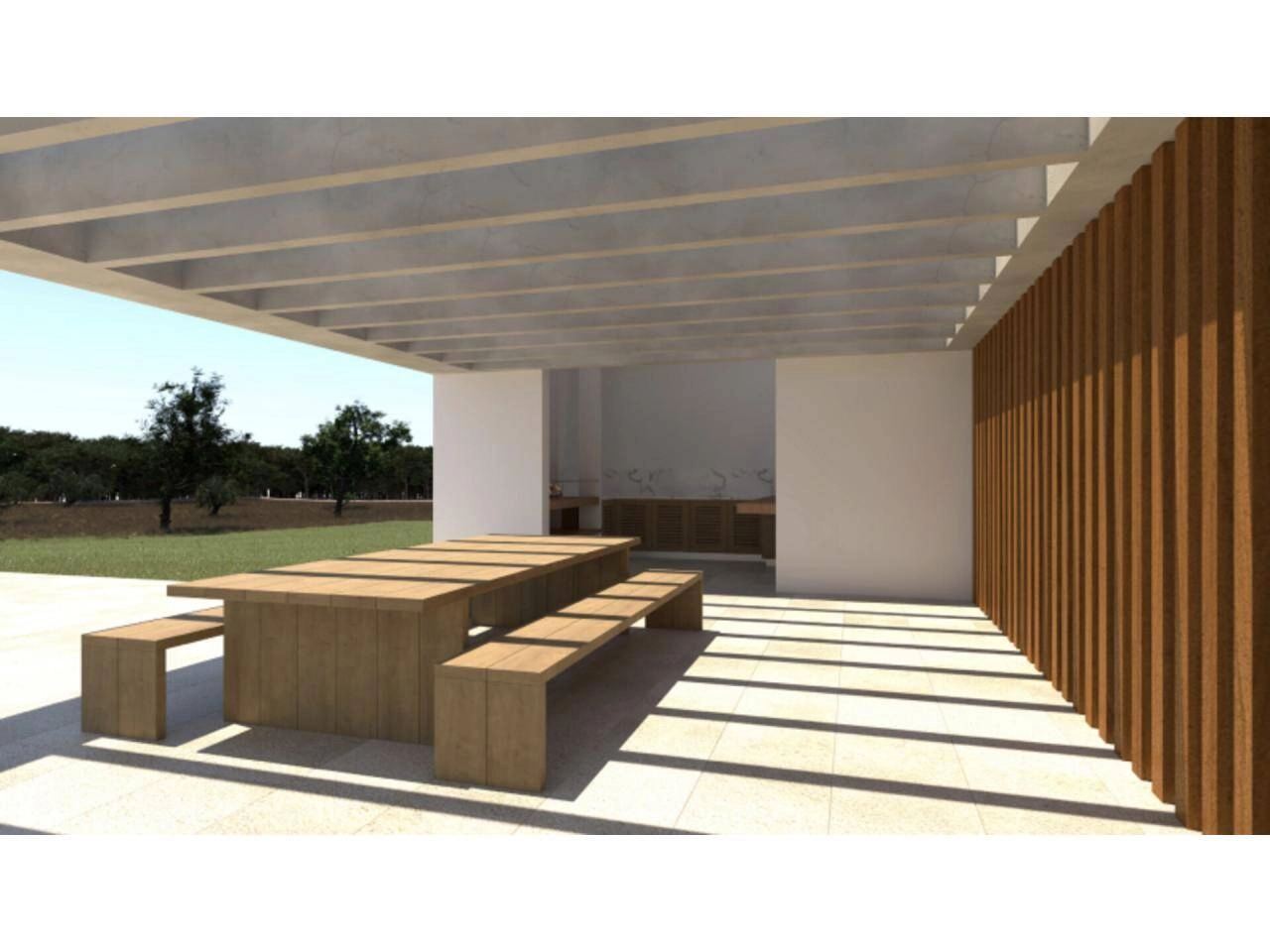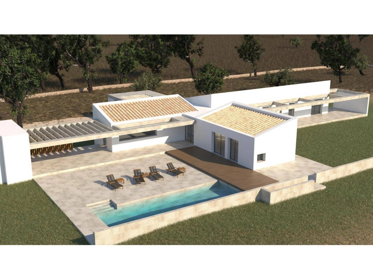 Das zukünftige Gebäude mit großzügigem Wohn- und Essbereich, Küche, 4 Schlafzimmer und 4 Badezimmer wurde so konzipiert, dass es viele schöne offene, überdachte und halbschattige Terrassen hat.