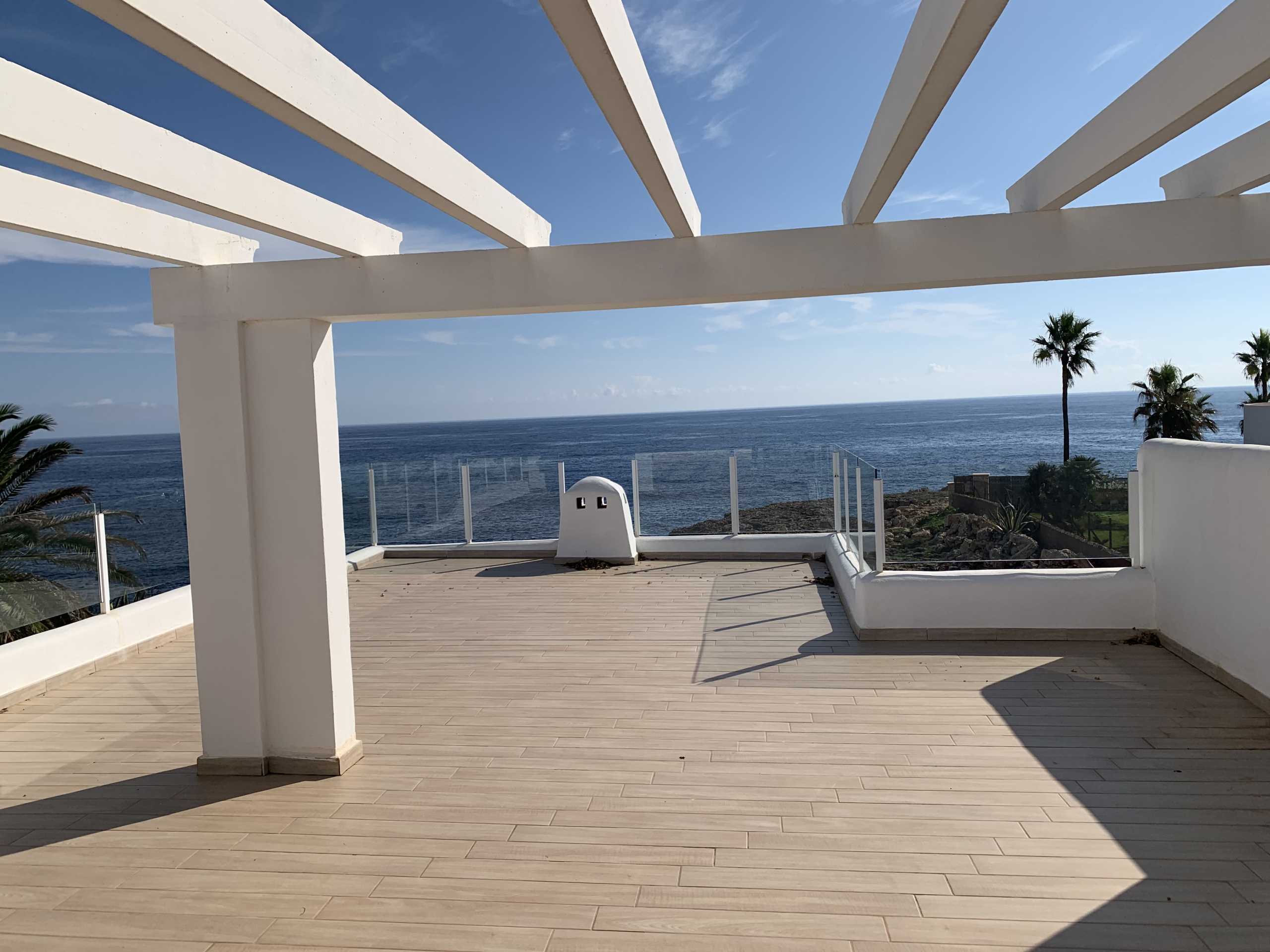 In einer von Ibiza inspirierten Villa entlang der malerischen Küste wird ein luxuriöser Lebensstil in bezaubernder Umgebung geboten. Die exklusive Immobilie mit erstklassiger Lage am Meer auf einem 994 m² großen Grundstück bietet eine Wohnfläche von 275 m² über zwei Ebenen. Der Eingang führt durch einen von Rasen umsäumten Pfad zur Eingangshalle, von der aus ein lichtdurchflutetes Wohn- und Essambiente mit Meerblick erreichbar ist. Die untere Ebene beherbergt zwei Doppelschlafzimmer mit eigenen Bädern. Über eine Innentreppe erreicht man den ersten Stock mit Terrassen und einem großen Masterschlafzimmer. Von hier aus gelangt man zur prächtigen Dachterrasse mit Pergola, ideal für sonnige Stunden mit Blick aufs Meer. Ein Pool mit Sonnenterasse komplettiert das Paradies am Meer.